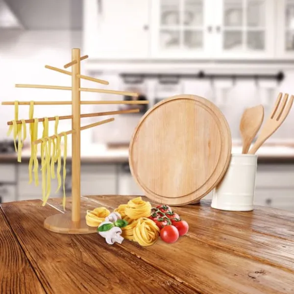 Detta pastaställ i bambu erbjuder en praktisk och naturlig lösning för att torka hemmagjord pasta och köksörter. Den är enkel att montera, har avtagbara armar och en kompakt design som gör den smidig för alla kök, medan de förskjutna armarna säkerställer att pastan inte klibbar ihop. Den stadiga basen ger stabilitet under användning.