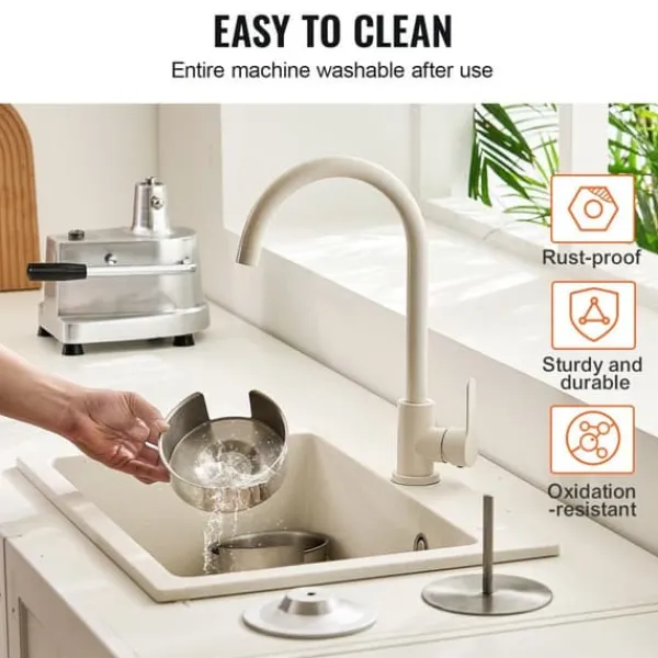 Lätt att rengöra: Hamburgarpressen är tillverkad av ett hölje i anodiserad aluminiumgjutning med rostfria kugghjul och en livsmedelstablett av rostfritt stål SUS304, vilket möjliggör en grundlig rengöring.