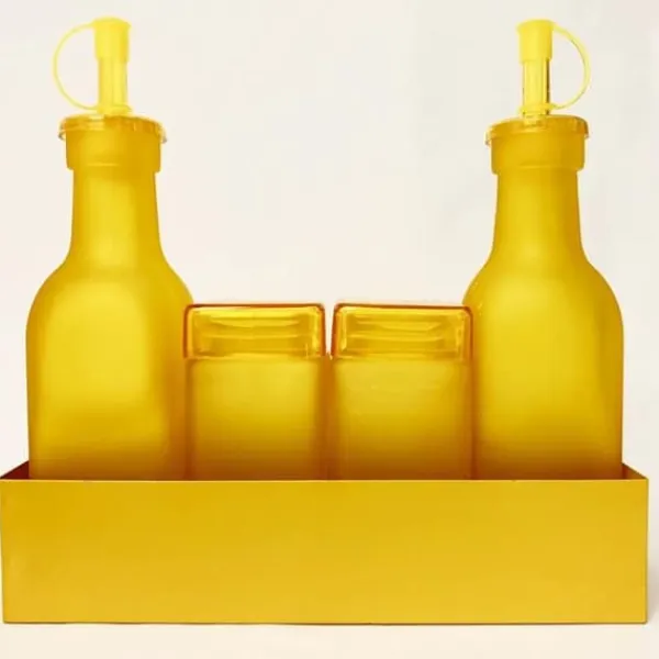 Gröna i detta set tillför fräschör och stil på bordet. Monocromo kryddset från Pusher är utrustat med en lätt hanterlig bricka och har 4 klassiska behållare för olja, vinäger, salt och peppar. Brickan är i metall och behållarna är i glas, lock och droppskydd är i plast. Med en enda rörelse kan du flytta alla 4 kryddor. Flaskorna har en kapacitet på 150 ml, medan salt- och pepparburkarna har en kapacitet på 130 ml. Egenskaper för Monocromo kryddset: setet består av: behållare för olja, vinäger, salt och peppar + behållarbrickan. Praktisk och färgglad tillbehör för bordet. Material: metall, glas och hållbar plast. Kapacitet flaskor för olja och vinäger: 150 ml. Kapacitet flaskor salt och peppar: 130 ml. Storlek på setet: 20×4.5×20 cm. Färg: gul.