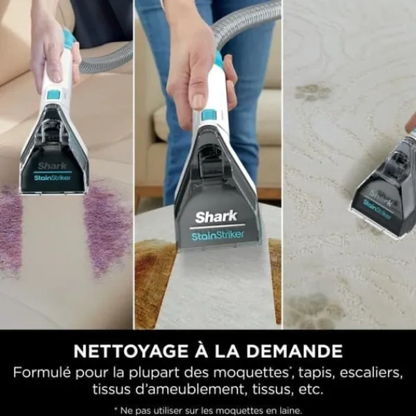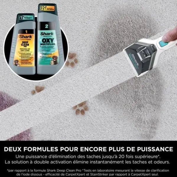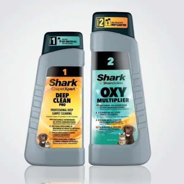 Lösningen Shark CarpetXpert Deep Clean Pro tar bort smuts och skräp, medan Shark StainStriker OXY Multiplier riktar sig mot fläckar och dofter. Ingen förbehandling krävs. Endast kompatibel med Shark StainStriker rengörare.