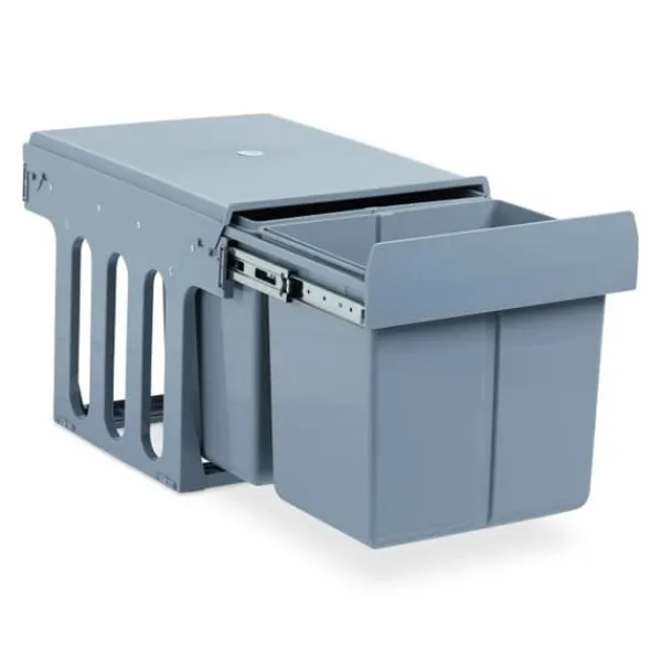 Robust källsorterare med två kärl. Dubbelkärlet håller köket organiserat och erbjuder två kärl för källsortering. Med en kapacitet på 15 liter vardera är källsorteringssystemet tillräckligt stort för förpackningar och papper. Organiskt avfall kan också slängas i dubbelkärlet. Det gångjärnsförsedda locket håller obehagliga lukter inne i dubbelkärlet. Perfekt för skåpet under diskbänken, den gråa, utdragbara plastkärlet är praktiskt, särskilt i små kök.