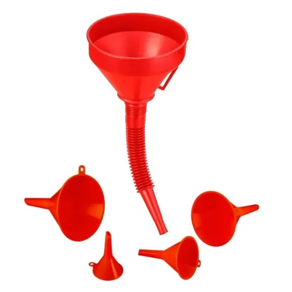 Universellt trattset för hemmabruk och bilbruk Detta trattset är perfekt för att byta olja eller fylla på kylvätska. Den stora tratten har en flexibel slang som kan tas bort vid behov, vilket gör påfyllningen mycket enklare. En finmaskig sil förhindrar att oönskade partiklar kommer in i påfyllningshalsen. Trattsetet är också praktiskt för hemmabruk: fyra mindre storlekar är praktiska i köket och kan staplas inuti varandra för att spara utrymme. De kan också hängas upp med hjälp av upphängningsöglorna.