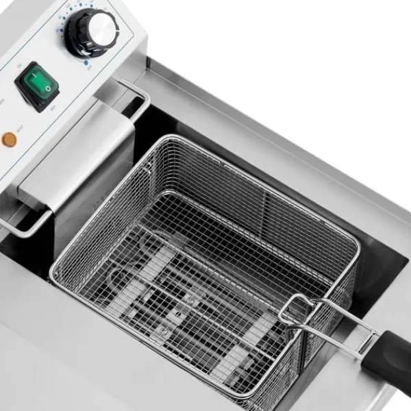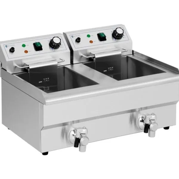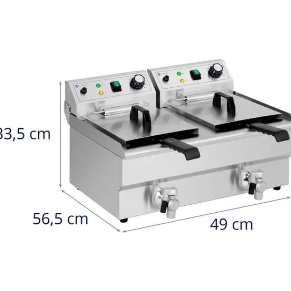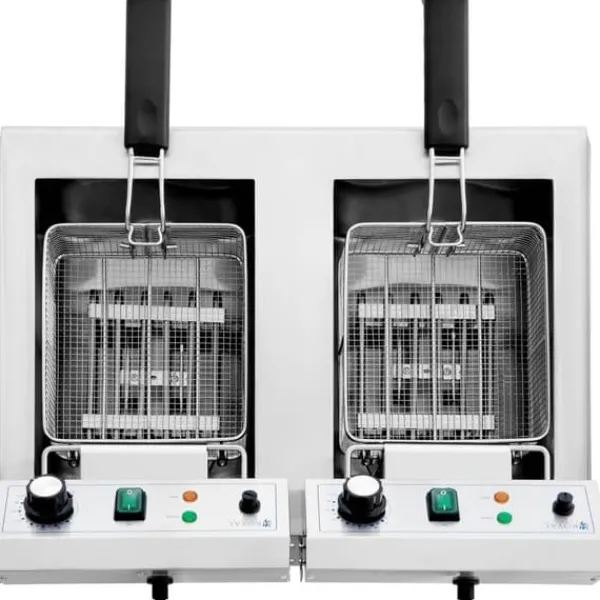 Den dubbla elektriska fritösen är utrustad med två behållare på 11 L, som kan fyllas med upp till 9 L olja vardera för frittering. Detta ger dig möjlighet att fritera stora mängder pommes frites samtidigt. Denna el-fritös är mångsidig inom professionell gastronomi, där den kan användas för att fritera fisk, grönsaker eller snacks. Eftersom båda friteringsbehållarna kan användas oberoende av varandra är det heller inga problem att fritera en mängd olika rätter samtidigt.
