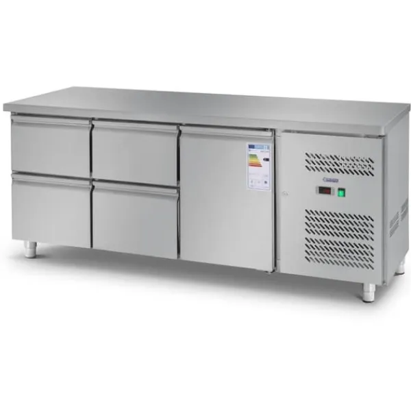 Ont om plats för livsmedel och drycker?! Det är ett problem som snabbt kan lösas med denna kylbänk, för den erbjuder en kylkammare och fyra lådor. Där kan färska produkter, såser, glasyrer eller sidorätter förvaras separat. Lådorna är lämpliga för GN behållare. En stor gallerhylla hjälper dig att organisera dina matvaror på ett praktiskt sätt. Den rostfria dörren är utrustad med gummitätningar och stänger kylkammaren tätt.