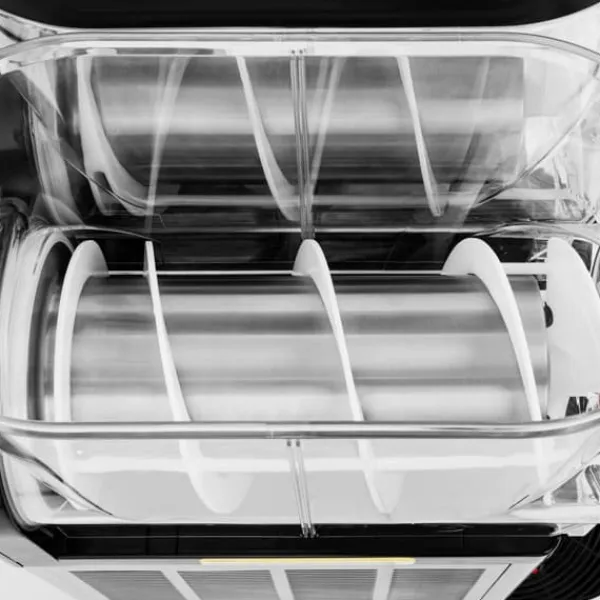 Slushmaskinen har 2 behållare på 12 l vardera för produktion av slush, så att du kan kombinera olika färger och smaker i en och samma maskin. För en snygg presentation är behållarna gjorda av transparent, BPA-fri plast, och lyses upp av effektiva LED-lampor. Omröraren håller den iskalla drycken i rörelse och lockar på magiskt sätt dina gäster. Du kan använda de stora tappkranarna utan ansträngning och blanda din slush efter din smak. Droppbrickorna håller din arbetsplats ren, även när blandningen blir mer turbulent. Behållarna skyddas uppifrån med ett lock.