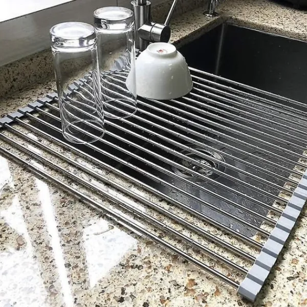 Detta diskställ i snyggt rostfritt stål rullar du enkelt ut över diskhon när du har diskat klart, sparar både plats och tid då du slipper torka av därunder! När disken har torkat rullar du enkelt upp diskstället och ställer det åt sidan!