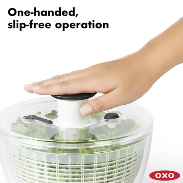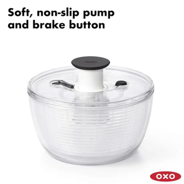 Med sin patenterade pumpmekanism och bromsknapp kan du enkelt använda denna salladsslunga med en hand. Den mjuka, halksäkra knappen gör det till en barnlek att pumpa och centrifugera vattnet ur dina grönsaker – perfekt när du har fullt upp i köket.