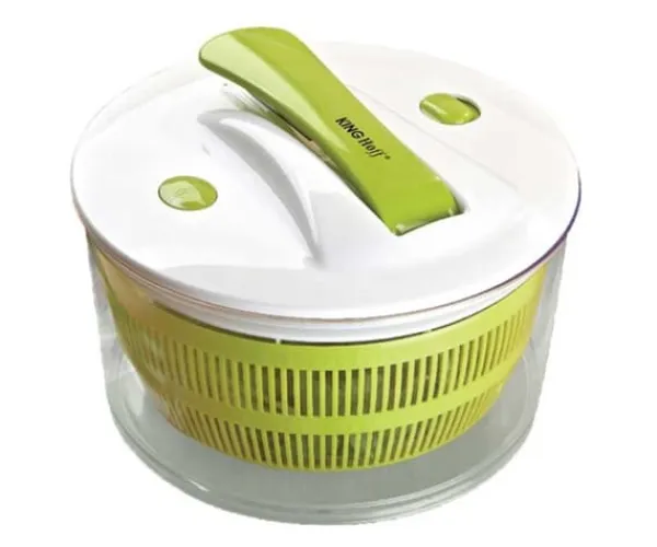 En funktionell anordning för att snabbt centrifugera vatten från tvättad sallad eller andra bladprodukter: spenat, örter, persilja, rucola etc. Spinnerkorgen kan användas som sil för att skölja grönsaker och sila pasta. Behållaren har en tratt för att underlätta avlägsnandet av vatten. Perfekt för snabbtorkande sallad. Enkel och snabb att använda. -skålens diameter: 22 cm -skålens djup: 13 cm