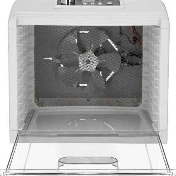 Frukt- och grönsaksdehydrator – effekt 500 W, för att torka kött, svampar, örter, te, nötter, frön, pasta, kakor, pannkakor, 6 hyllor, diameter på hyllorna 33 cm, digital kontroll, automatisk avstängning, med timer, justerbar temperatur från 35 till 75 °C, förinställda program, med överhettningsskydd, skärm, Air Flow-teknologi, horisontell luftström, hyllor i plast, material på dehydratorn i plast, mått 31 × 34,5 × 45 cm (H × B × D)
