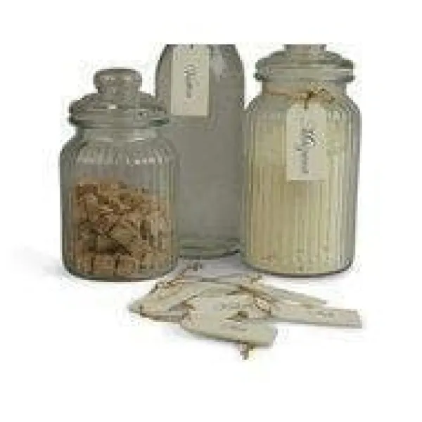 8 st vIta trä skyltar, brickor med grå text till förvaringsburkar med text på varje och snöre.