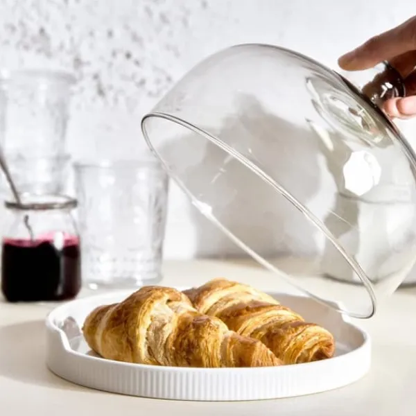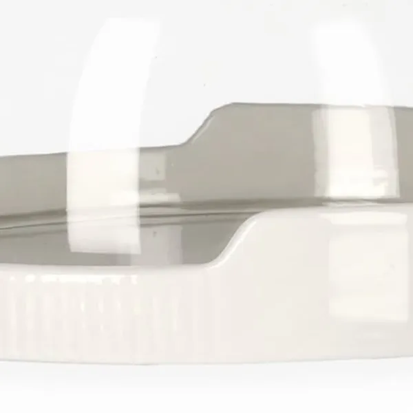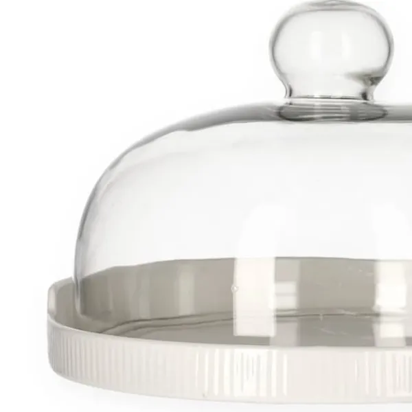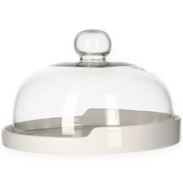 Denna FINCAN-produkt är uppdelad i två delar: den första är ett halvcirkelformat glaslock, den andra är en porslinsbotten där du placerar dina valda bakverk. Botten är ljusgrå. Hela saken har mått 22 cm.