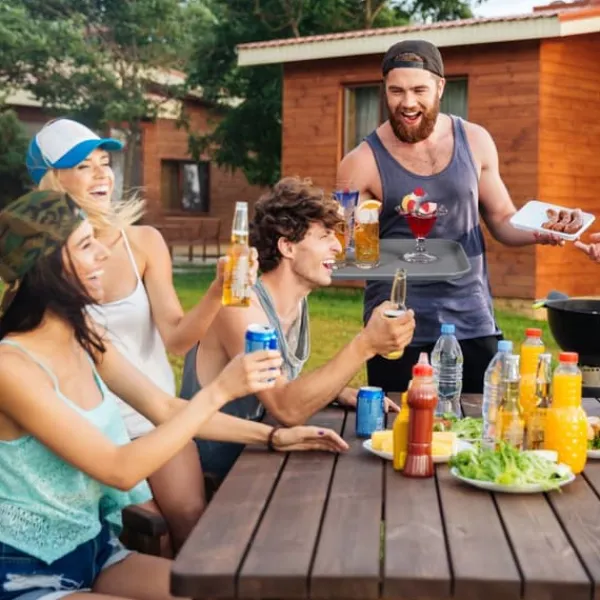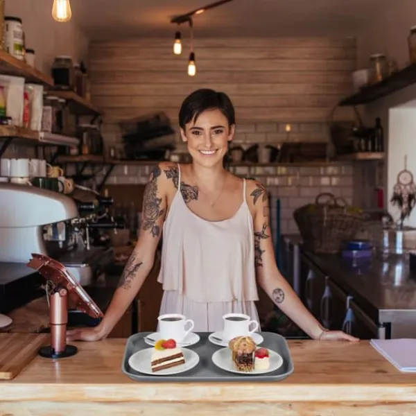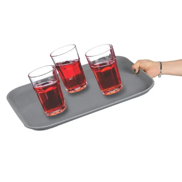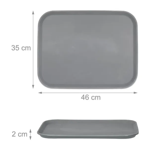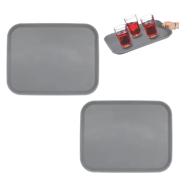 Set med 2 rektangulära serveringsbrickor, halkfri yta, upphöjd kant, mått: 2 x 46 x 35 cm, vikt: 1 kg vardera, material: 70% plast, 30% gummi, färg: grå, ej diskmaskinssäkra