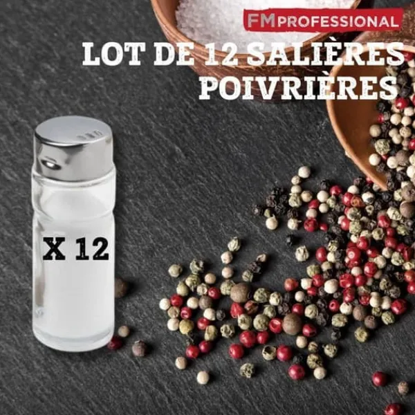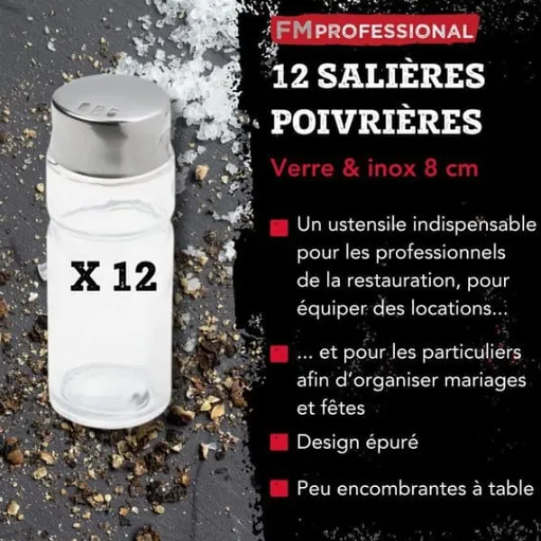 INNEHÅLL: 12 glasbehållare. Detta set med 12 salt- eller pepparkar passar perfekt för yrkesverksamma inom restaurangbranschen. Det är också nyttigt vid bröllop, fester eller födelsedagar. Alla kan krydda sina rätter efter smak. FM Professional är ett varumärke från Fackelmann-gruppen, riktat till yrkesverksamma inom matlagning och bakning. FM Professional samlar köks- och bakredskap i paket som är intressanta för yrkesverksamma inom branschen. Bak- och köksredskapen som erbjuds av FM Professional är tillverkade av högkvalitativt rostfritt stål och är mycket hållbara. Varumärket strävar efter att föra kvaliteten hos professionella redskap in i alla kök.