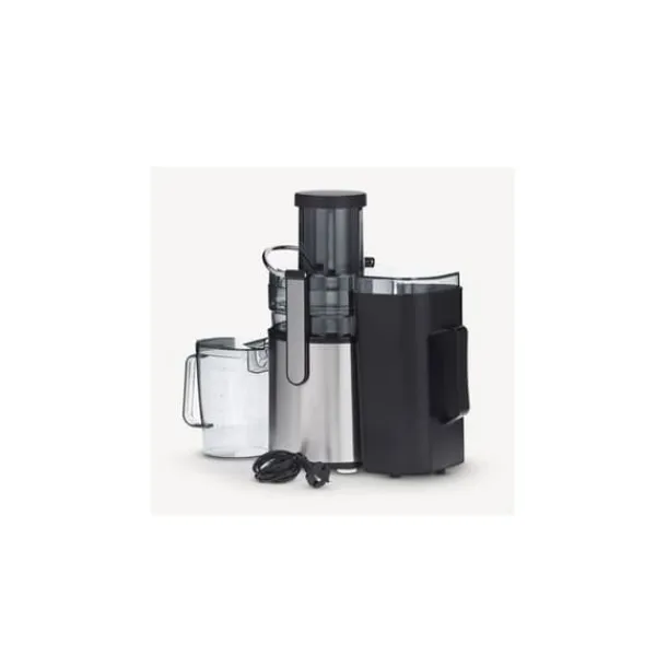 SEVERIN ES 3570-centrifugen har en elektrisk effekt på 800 Watt och en massabehållares kapacitet på 2,5 liter. Den har en extra stor behållare med en diameter på 7 cm för hela frukter eller grönsaker, 2 hastigheter för att tillsätta mjuka och hårda ingredienser och en extrem hastighet för att extrahera maximal juice.