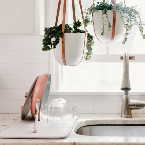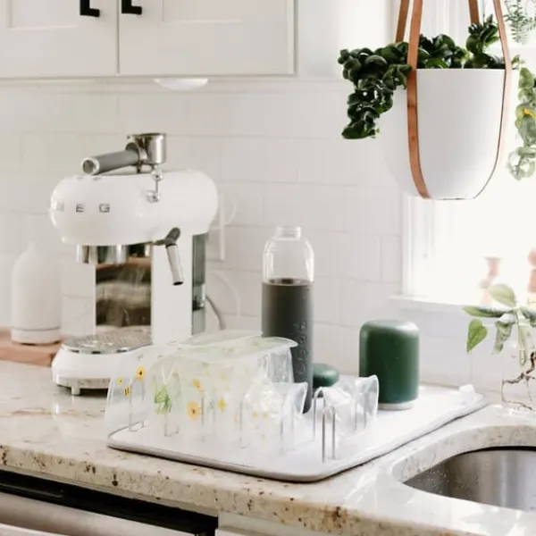Modern 2-i-1 diskställ med matta av återvunnen mikrofiber Certifierad matta av återvunnen mikrofiber för köksredskap och svårplacerade föremål.