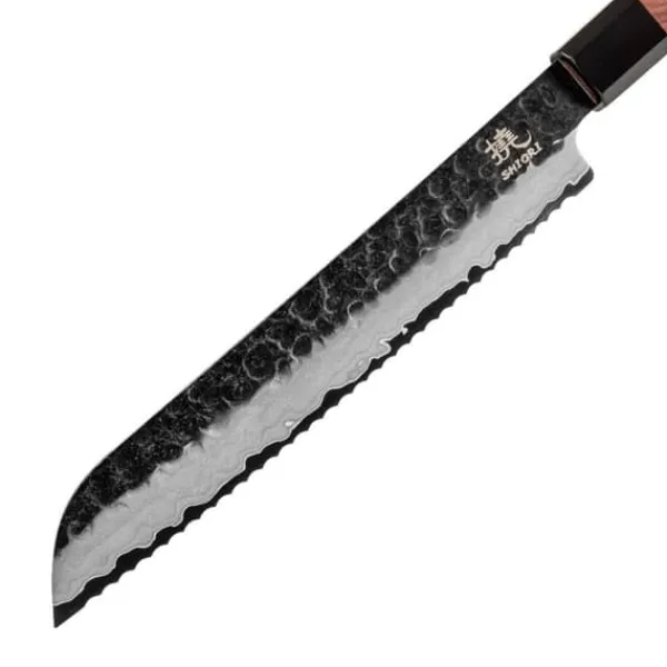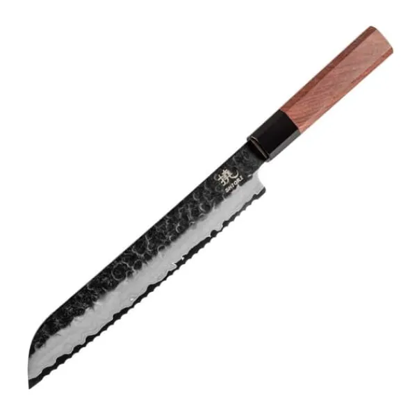 Shiori-kniv från 撓 Mitsuki Surai-serien. Detta är en kniv som gör att du kan skära vilken typ av bröd som helst utan att trycka det överdrivet mot brädan. Oavsett om det är färska frallor eller varmt bröd från ugnen – skivning är ett nöje. Det 22 cm långa bladet med tandade tänder kommer perfekt att klara hård, krispig skorpa, tack vare vilken vi kan få tunna skivor med bibehållen form på brödet. Bladet är tillverkat av trelagers 10Cr15CoMov stål. Stålets flerskiktiga karaktär gör strukturen av de olika lagren av varje kniv mycket hållbar och flexibel. Handtaget är tillverkat av buffelhorn och redwood, vilket ger klassisk elegans. Kombinationen av mycket bra råvaror ger en unik produkt – elastisk, hård, vass. Den perfekta kniven i varje kök. Perfekt produkt för en present. *HRC-hårdhet – detta är ett kriterium som låter dig bestämma klassen för en kniv, uttryckt i grader HRC (Rockwell-skalan). Detta berättar hur hårt stålet används för att skapa en japansk kniv. Ju högre värde uttryckt i grader HRC, desto bättre stål som kniven smiddes av är naturligtvis. Det är känt att ju högre HRC-värdet är, desto längre förblir kniven vass och det kräver mindre frekvent skärpning med en vattensten.