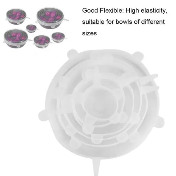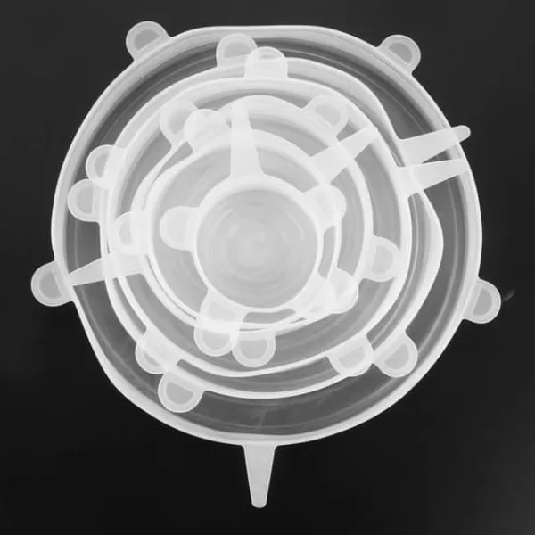 Detta parti med 6 transparenta silikonlock från VVIKIZY är återanvändbara, flexibla och vattentäta. Tillverkade i livsmedelsgodkänd silikon, passar de olika skålar i olika storlekar, är perfekta för mikrovågsugnen och frysen, och ersätter plastfolie effektivt.