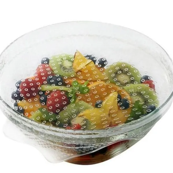 Dessa stretchiga plastförvaringslock är hållbara och återanvändbara. De anpassar sig efter dina livsmedel för att hålla dem färska och skyddade. De är mikrovågssäkra och fryssäkra, finns i 3 storlekar (10×10 cm, 15×15 cm, 20×20 cm) och minskar användningen av plastfilm.