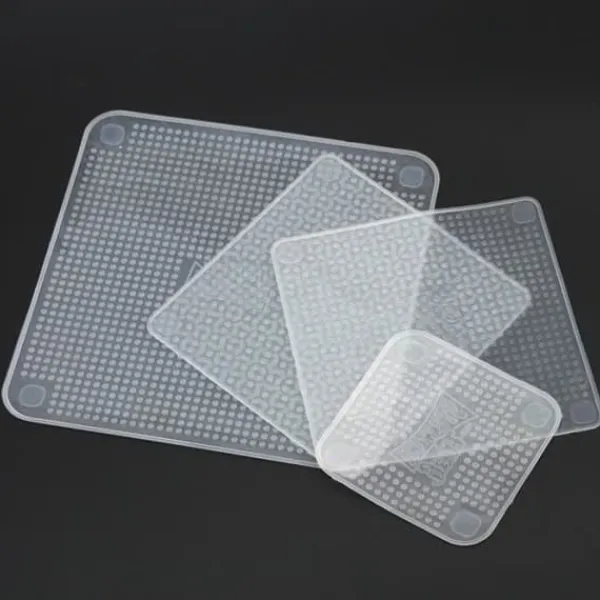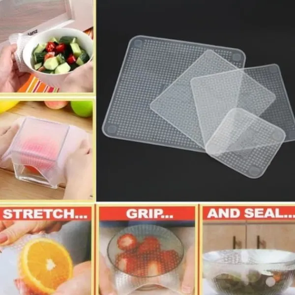 universell töjbar matkonservering. Set med 4 matförvaringslock i återanvändbar storlek skillnad Köksverktyg för att hjälpa din mat, frukt och grönsaker att hålla sig säkra. Material: silikon. Färg: transparent.