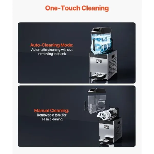 Slitstark och lätt att rengöra: Denna kommersiella slushmaskin är tillverkad av rostfritt stål och livsmedelsgodkänd PC-tank, vilket gör den hållbar och lätt att rengöra. Tanken har automatisk rengöring med en knapp och de modulära komponenterna kan enkelt tas isär utan verktyg för enkel underhåll och rengöring.