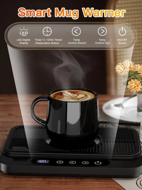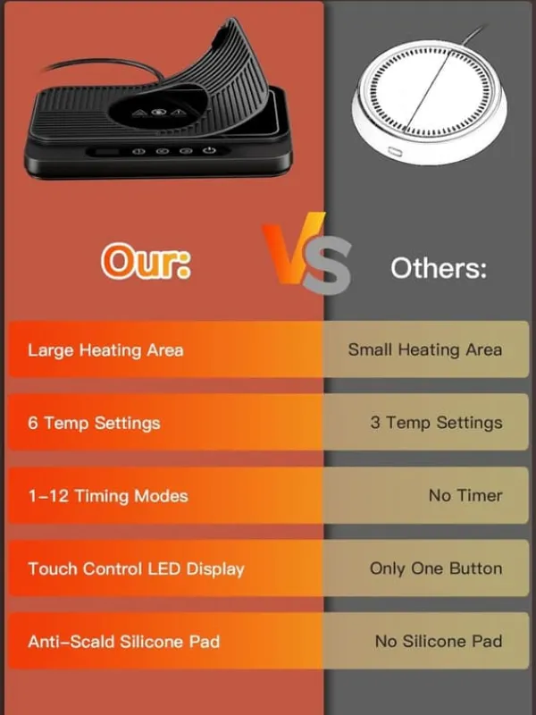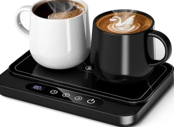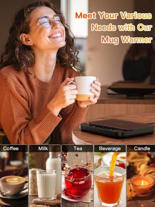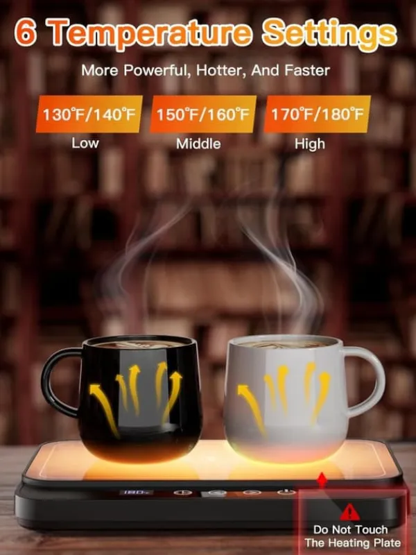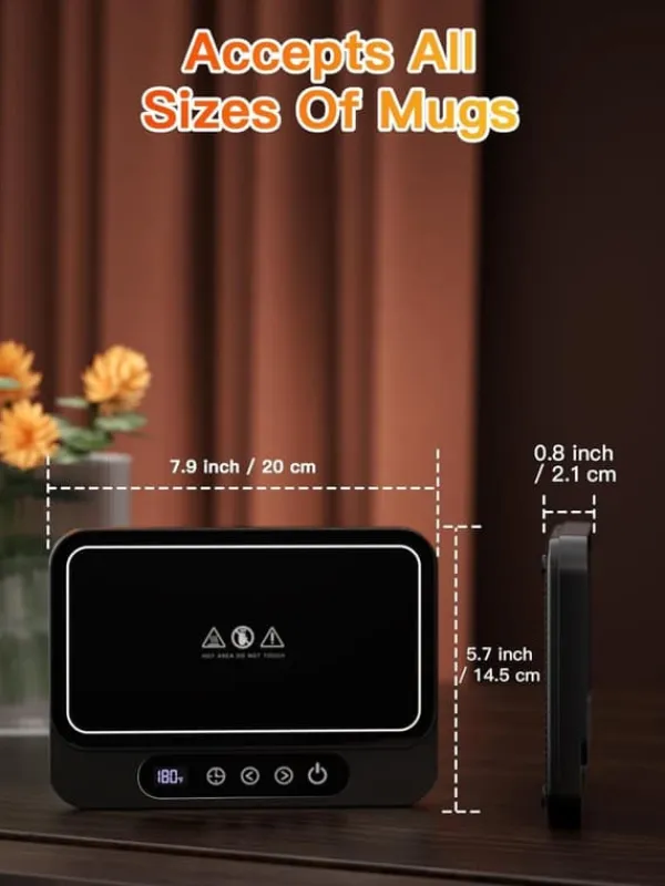 Värmarens stora platta gör att du enkelt kan värmma två muggar samtidigt, oavsett storlek. Den passar alla typer av koppar – en perfekt lösning för hemmet eller kontoret. (*Tips: Använd muggar med platt botten och tunna väggar för bäst värmeledning.*)
