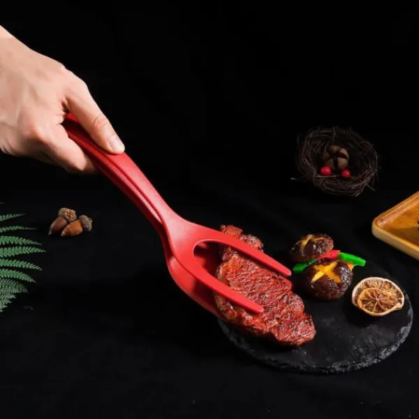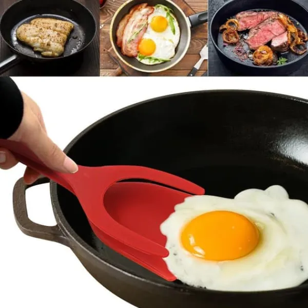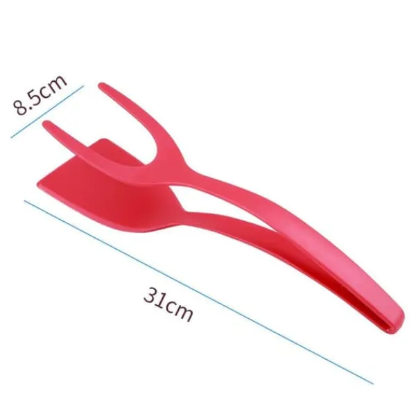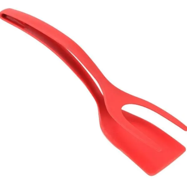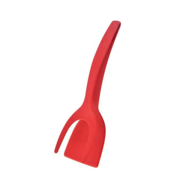 Det här köksredskapet kan användas för att vända det mesta i stekpannan. Verktyget fungerar som en kombinerad klämma och stekspade, och passar perfekt för såväl ägg som kött och pannkakor. Verktyget är tillverkat av värmetåligt silikonmaterial i röd färg.