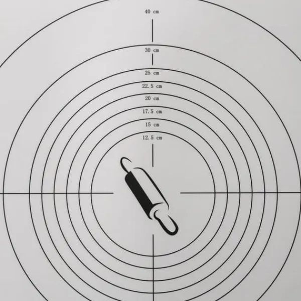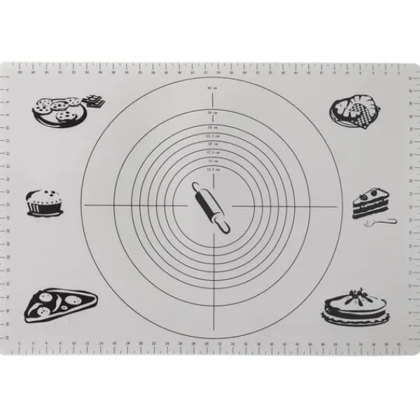 STOR YTA – En 65 x 45 cm bakelsebräda. Användbar i varje hem. Den har en stor användbar yta och tryckt längd och diameter mäter i centimeter. Måtten, i form av cirklar i olika storlekar, är användbara vid tillredning av till exempel pizzadeg i rätt storlek.