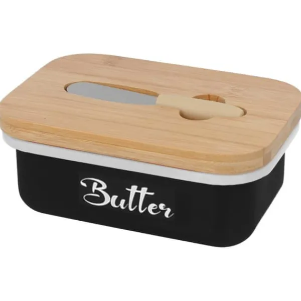 - Smörfatet är tillverkat av slitstarkt, korrosionsbeständigt rostfritt stål och locket är tillverkat av miljövänlig bambu – en kombination av estetik och funktionalitet.