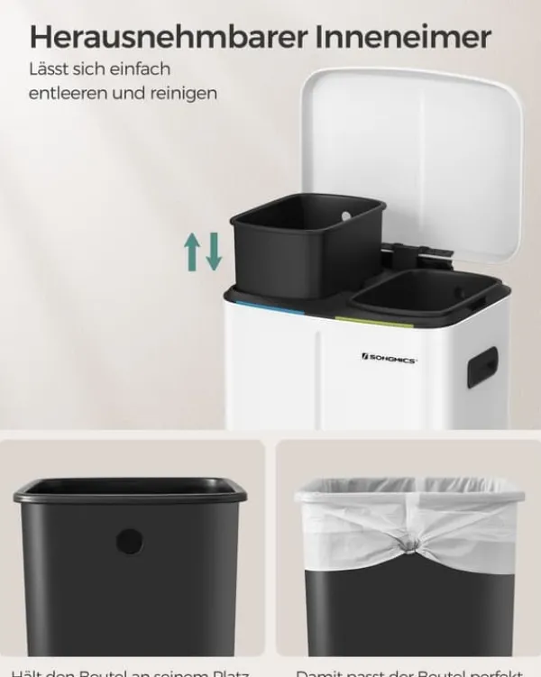 Varför ska du välja den här soptunnan? den vita färgen ger en elegant touch till ditt kök. den förstärkta stålbehållaren är robust och hållbar. standardfunktioner:Återvinning kan också vara enkeltDen här pedaltunnan med 2 separata fack gör det enkelt att sortera ditt avfall, t.ex. restavfall och organiskt avfall. Allt du behöver göra är att trycka på pedalen och kasta avfallet i det inre facket. Du behöver inte ens röra soptunnan med handen, vilket säkerställer hygienen.En ”valp- och barnsäker” soptunnaRysslar din hund ofta i soptunnan? Sträcker sig dina småttingar ofta ner i den öppna papperskorgen? Om så är fallet vill du sätta stopp för det. Det är här vår pedalbehållare kommer in i bilden! Locket öppnas bara när du trycker på pedalen, och det högkvalitativa materialet och den praktiska designen på denna papperskorg erbjuder en smart lösning för avfallshantering. Skaffa den här soptunnan, använd den och dela resultatet med oss i recensionerna!Produktdetaljer:Färg: VitMaterial: Pulverlackerat stål, PP-plast (innerbehållare)Mått: 44,5 x 36 x 60 cm (L x B x H)Mått på innerbehållare: 28,5 x 19 x 50 cm (L x B x H)Total höjd (med öppet lock): 92 cmVikt: 9 kgLeveransens omfattning:1 x soptunnaSONGMICS Anmärkningar:För att rengöra produkten, torka av den med en mjuk, fuktig trasa och använd milda rengöringsmedel vid behov.