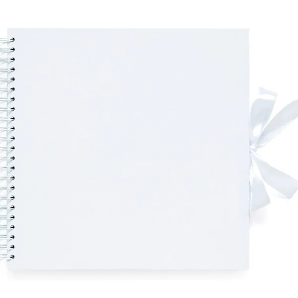 Vitt album med spiralrygg och omslag av kraftig kartong, med ett dekorativt sidenband (bredd 24 mm) att knyta ihop till rosett.
