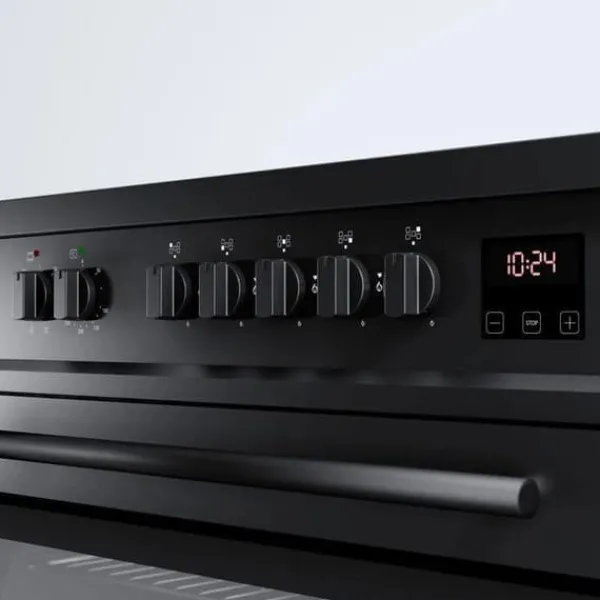 Gurari E 913 BL – induktionsspis 90 cm, elegant svart design med accenter i rostfritt stål, 5 zoner varav 2 Flex (40×20 cm) med booster, central zon Ø 200 mm (2300–3000 W), andra zoner: Ø 145 mm (1400–1850 W), Ø 160 mm (1400–2100 W), Ø 250 mm (2300–3000 W), multifunktionsugn XXL 121 L, 8 lägen: varmluft, grill, upptining, värme upp/ned, osv., easy clean emalj, teleskopiska skenor, LED-touch programmerare, push-pull låda, ugnslock med dubbelglas, inre belysning, tillbehör: galler + plåt, gjutjärn grillplatta tillgänglig som tillval, justerbara fötter (upp till 3 cm), installation utan fötter möjlig, europeisk kvalitet från det tyska märket Gurari, dimensioner: 94×90×61,5 cm, effekt: 11 kW, 3 faser, 400 V, vikt: 76 kg.
