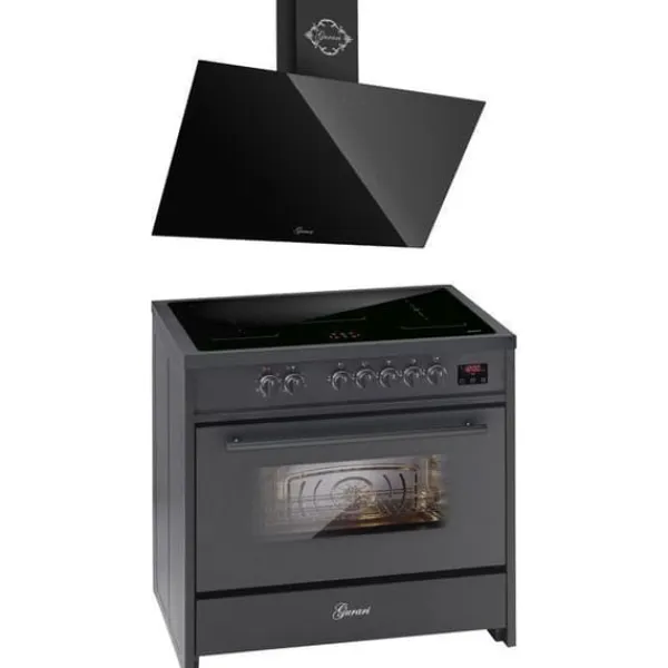 Gurari E 913 BL – 90 cm induktionsspis med XXL-ugn, elegant svart design med rostfria accenter, spishäll med 5 zoner varav 2 flexzoner (40×20 cm, 1850–3000 W), central zon Ø 200 mm (2300–3000 W), övriga zoner: Ø 145 mm (1400–1850 W), Ø 160 mm (1400–2100 W), Ø 250 mm (2300–3000 W), multifunktionell ugn 121 L, 8 lägen: varmluft, grill, upptining, över/under värme, m.m., Easy Clean-emalj, teleskopiska rälsar, LED-beröringsprogrammerare, push-pull-låda, dörr med dubbelglas, inre belysning, justerbara ben upp till 3 cm eller installation utan ben, tillbehör: galler, plåt, gjutjärnsg grillplatta som tillval, dimensioner: 94×90×61,5 cm, effekt: 11 kW, 3 faser, 400 V, vikt: 76 kg, högkvalitativ europeisk tillverkning av Gurari, familjeägt tyskt märke.