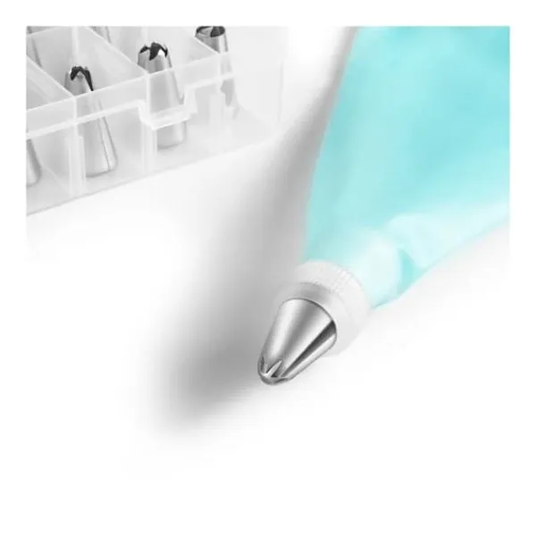Detta bakset innehåller en spritspåse, 34 tips och 2 adaptrar som förvaras i en förvaringslåda. Det är lämpligt för att skapa vackra dekorationer på tårtor, kakor eller cupcakes. * Mått på lådan: 19,5 x 14 x 3,5 cm * Material på påsen: livsmedelssilikon * Material på 2 adaptrar: livsmedelsplast * Material på 34 tips: rostfritt stål Funktioner: spritspåse