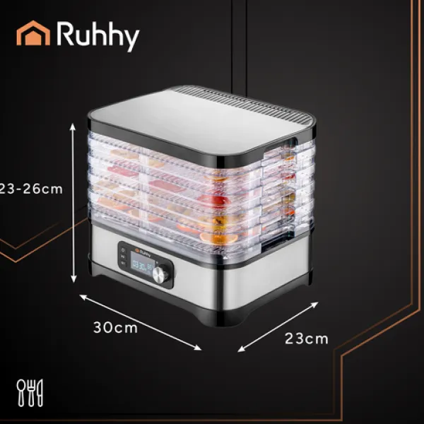 Den universella RUHHY 400 W torkaren gör det möjligt att torka svamp, frukter, grönsaker och örter – den har 5 brickor med en total kapacitet på 10 liter, justerbar temperatur (35-70 ° C) och en tydlig LCD-skärm med en programmerare som kan ställas in i upp till 72 timmar. Setet inkluderar också brickor för flytande produkter, nät och non-stick mattor – för maximal bekvämlighet. Energibesparande och tillverkad av säkra BPA-FREE-material – idealisk för ett hemförråd året runt.