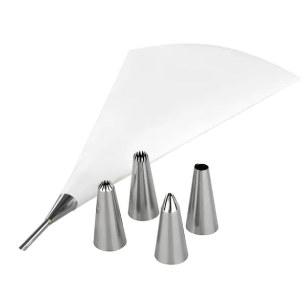 Denna uppsättning innehåller spritspåse 26 cm av god kvalitet, en skruvadapter för att underlätta byte av tyllar och 5 tyllar av rostfritt stål som täcker ett urval av mönster.
