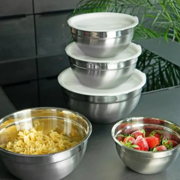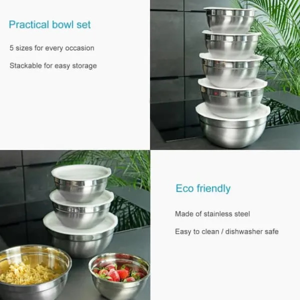 Högkvalitativt rostfritt stålset med 5 salladsskålar och lufttäta lock.