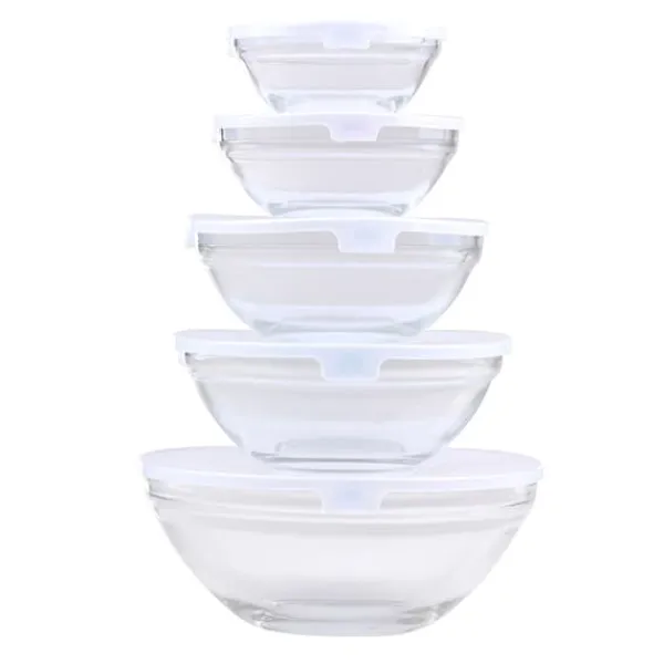 Upplev mångsidigheten i Alpinas glasskålset, perfekt för allt från förvaring av rester till servering av sallader. Dessa genomskinliga skålar gör det enkelt att se innehållet och kommer med praktiska lock som håller din mat färsk. Setet inkluderar fem storlekar för att passa alla dina behov och är dessutom stapelbara för att spara utrymme i köksskåpet.