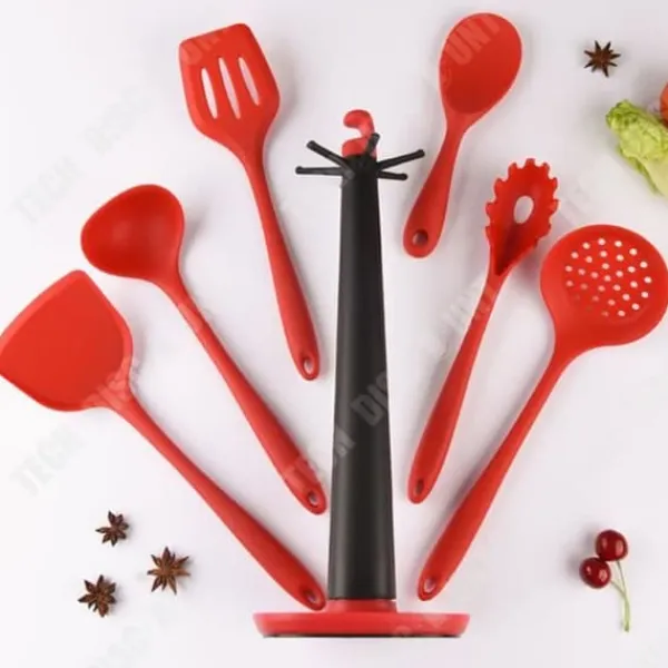 Upptäck TD®s multifunktionella silikon köksredskapsset. Mjukt och bekvämt, det inkluderar en roterande hållare för praktisk förvaring. Perfekt för att spara utrymme, detta set förenar funktionalitet och samtida design.
