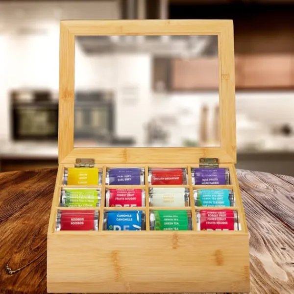 Håll din tesamling organiserad och lättillgänglig med denna bambu tebox, designad för både funktionalitet och stil. Dess smarta layout ger en tydlig överblick över dina teer och kan även användas för att förvara kosmetika eller pysseltillbehör, vilket gör den till ett mångsidigt tillskott i hemmet. Denna tebox är också en omtänksam present för alla tillfällen.