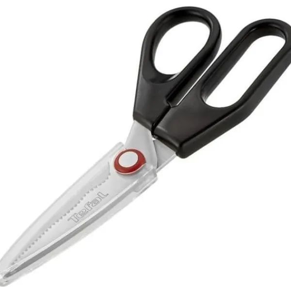 INGENIO skårad sax från TEFAL i plast och rostfria blad, färger: röd och svart. Bekväma handtag för effektiv skärning. Säkerhets- och hygienskydd för förvaring av redskapet. Idealisk för att baka eller förbereda fisk. Föredragen rengöring för hand: löstagbara blad för enkelhet.