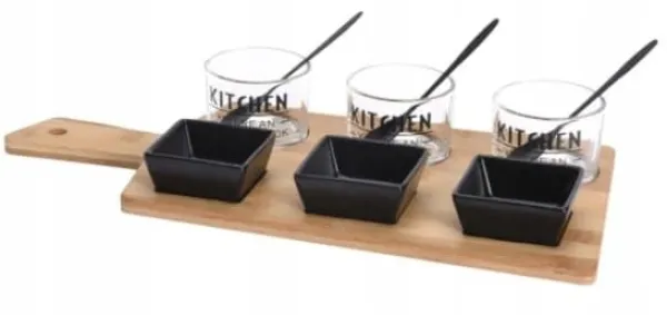 Snacksetet från EXCELLENT HOUSEWARE är perfekt för förrätter och snacks. Passar i alla kök. Oersättligt vid förberedelser av fester . Det är perfekt för att placera förrätter på det – både varma och kalla. Setet innehåller ett bambubräda och 6 skålar – 3 transparenta med 3 skedar och 3 keramik. Skålarna är användbara för att servera såser, dippsåser och små snacks. Detta är en utmärkt presentidé!