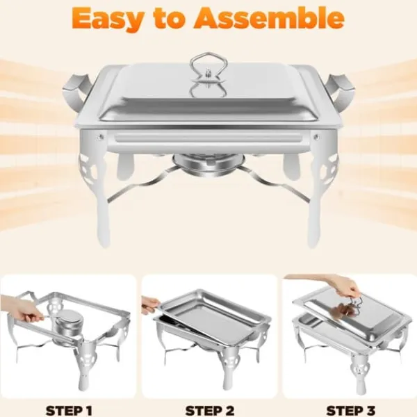 - Paketets innehåll: 1 x silverfärgad chafing dish i rostfritt stål (6 L), lock, vattenfat, matinsats, ram/stativ, hållare för bränslebägare