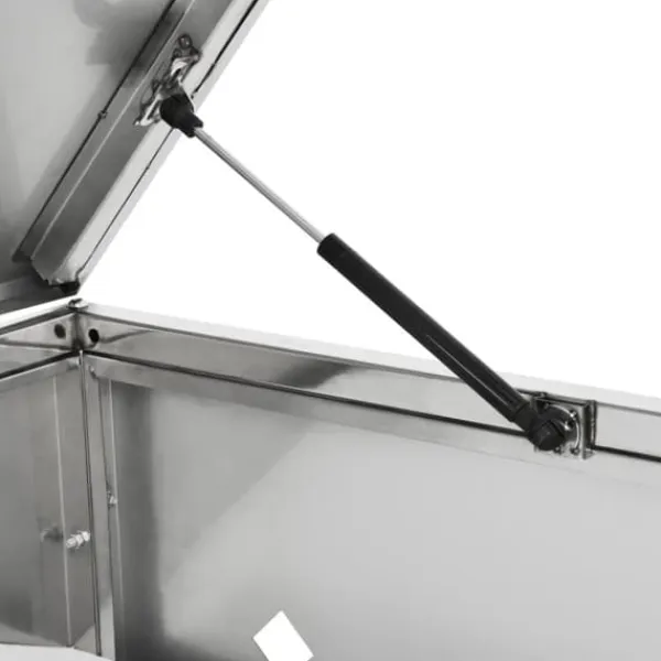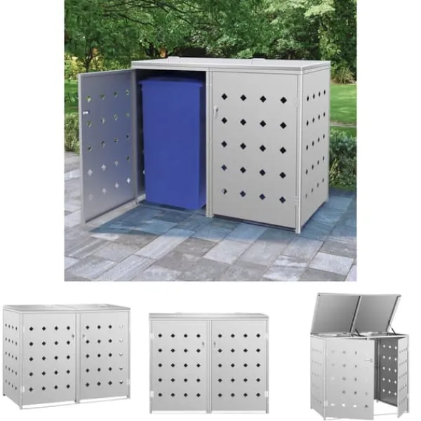 Skjulet för sopkärl är tillverkat av rostfritt stål och är ytterst väderbeständigt och hållbart. De praktiska ventilationshålen möjliggör luftcirkulation och förhindrar otrevliga lukter i skjulet, medan låssystemet gör att soporna förvaras säkert. Dessutom låter den praktiska dörren dig att enkelt sätta in och ta ut sopkärlet.