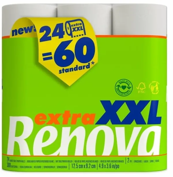 Renova Extra XXL toalettpapper 24 rullar Renova Extra XXL toalettpapper har över 2 gånger fler ark än en vanlig Renova-rulle – 37,5m per rulle! Det är ett mycket praktiskt och bekvämt alternativ eftersom det minskar frekvensen av att byta ut rullarna i pappershållaren. När du köper Renova Extra XXL 24R papper är det som om du hade 60 standardrullar. Vitt toalettpapper 325 ark per rulle 37,5 m per rulle 24 rullar per förpackning 2-lagers Luktfri Dermatologiskt testad Förpackningsmått: 37,5 x 25 x 36,8 cm Tillverkare: Renova EAN-kod: 5601028013307 Ursprungsland: Portugal