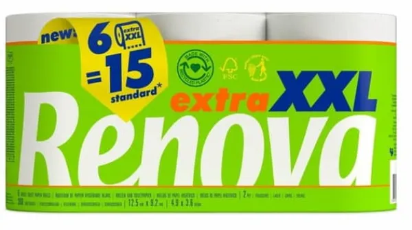 Renova Extra XXL toalettpapper 6 rullar Renova Extra XXL toalettpapper har över 2 gånger fler ark än en vanlig Renova-rulle – 37,5m per rulle! Det är ett mycket praktiskt och bekvämt alternativ eftersom det minskar frekvensen av att byta ut rullarna i pappershållaren. När du köper Renova Extra XXL 6R papper är det som om du hade 15 standardrullar. Vitt toalettpapper 325 ark per rulle 37,5 m per rulle 6 rullar per förpackning 2-lagers Luktfri Dermatologiskt testad Förpackningsmått: 37,5 x 12,5 x 18,4 cm Tillverkare: Renova EAN-kod: 5601028012164 Ursprungsland: Portugal