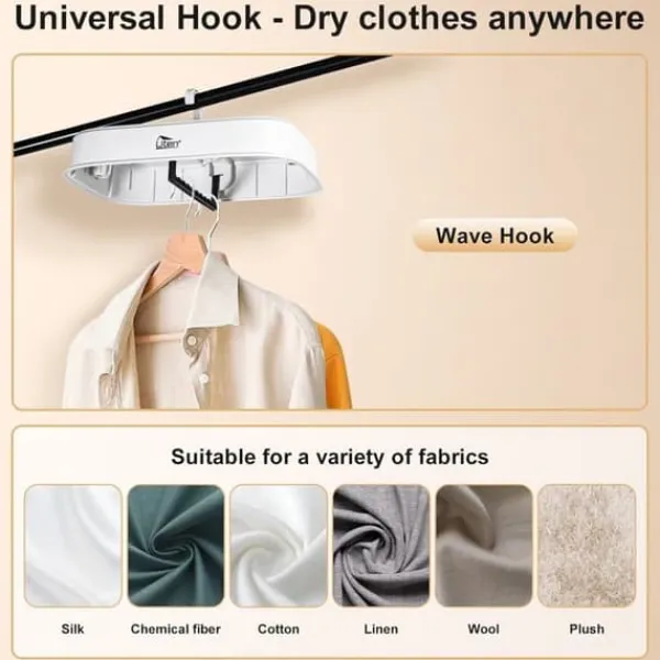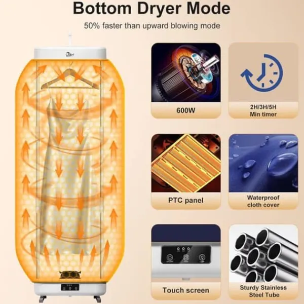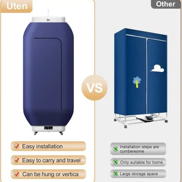 Upptäck Utens 600 W bärbara torktumlare, idealisk för användning hemma eller på resor. Avtagbar och utrustad med en timer, kan den placeras eller hängas, perfekt för studentbostäder, lägenheter och hotell.