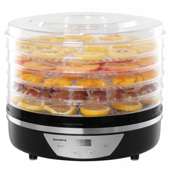 En enhet som är nödvändig i varje modernt kök, enkel och säker att använda. Torkar snabbt och effektivt svamp, örter, frukt och grönsaker. Tack vare noggrant utvecklade torkningsparametrar gör det att du kan bevara produkternas närings- och smakvärden. Flerskiktsarrangemang av siktar ökar torkningseffektiviteten. Funktioner: – 5 avtagbara, stapelbara mattorkarbrickor. – Livsmedel PP/AS; BPA-fritt, rostfritt stål – Torkbrickor som är lätta att rengöra – Elektrisk dehydrator i flera nivåer som konserverar olika typer av mat. – Lätt att använda, lätt att starta – intuitiv knapp. – Val av torkning med ett klick. – Justerbar tid på 1-48 timmar och temperaturinställning på 35-68 grader, låter dig torka olika livsmedelsprodukter vid lämplig temperatur. – Snabb, torr mat på timmar, inte dagar. Ett enkelt sätt att förbereda läckra, hälsosamma och naturliga mellanmål som bananchips, fruktrullar och beef jerky. – Digital LED-skärm – Strömförsörjning: 220-240 V 50/60 HZ – Effekt: 350 W – Storlek: ∅33 x 27cm Vad är torkning? Torkning är helt enkelt uttorkning. Tack vare att cirka 70 % av vattnet i frukt och grönsaker förångas, behåller produkterna sin hållbarhet. Som ett resultat av vattenavdunstning koncentreras ingredienserna som finns i frukt och grönsaker, tack vare vilka bland annat torkade produkter alltid är sötare än färska. Om vi torkar vår sommarskörd ordentligt kommer de att helt behålla alla bioelement, tanniner, syror och karoten och, vilket är mycket viktigt för våra tarmars funktion, fiber och pektin. Deras smak och lukt kommer också att förbli oförändrade.