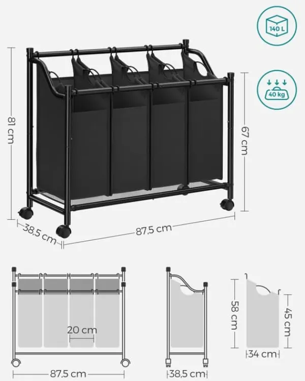 Denna tvättkorg med en kapacitet på 140 liter erbjuder en idealisk lösning för att organisera din tvätt. Fyra separata fickor håller alla dina kläder sorterade efter färg eller typ, vilket sparar tid under tvätten.