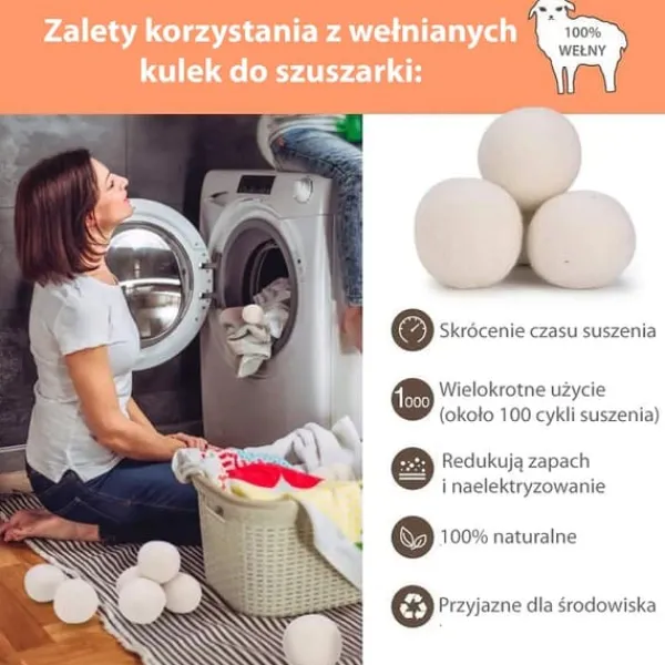 Att använda Natural Pro ullbollar i torktumlaren förkortar torkprocessen (ull absorberar kvarvarande fukt), vilket sparar tid och energi. Bollarna separerar kläderna från varandra så att varm luft kan cirkulera mer effektivt. Bollarna minskar skrynkling, har en antistatisk effekt och gör tvätten mjuk och fluffig. Dessutom är ulltorkbollar en skonsam och miljövänlig ersättning för engångstorkdukar.