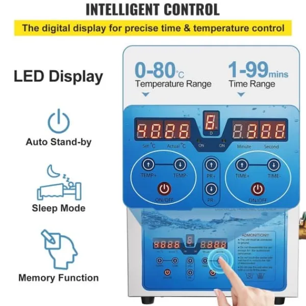 Tre högteknologiska ultraljudsgivare: Med tre högteknologiska ultraljudsgivare förbättras rengöringskapaciteten hos vår ultraljudsrenare. Den tar skonsamt bort fläckar från föremål på några sekunder. Värmeeffekt: 200 W; Ultraljudseffekt: 180 W.